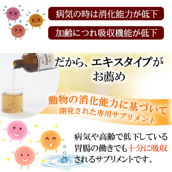 【アガペットゴールド】は、「わからないように工夫する、無理に与える」ようなことがありません。病気を患う子や、体調管理(健康ケア)が必要な子はとくに繊細! 与えやすさはサプリを選ぶうえで大切な要素になります。 多頭飼いで、個別に何かを与えるのが大変な方や、 お薬が苦手で味やニオイに敏感な子に最適です。 調子が悪く寝ている時間が長い子には、お口の横から少しずつ与えてあげることができます。 飼い主様もペットもストレスが無く与えられます。 ![]() 与えやすく、毎日継続することで、動物本来が持つ、健康を維持して免疫力を維持します。 |