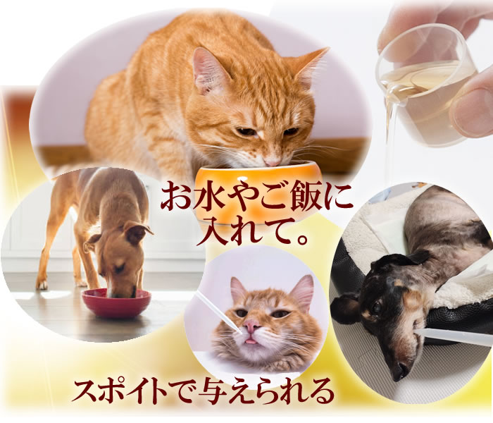 ほぼ無味無臭のエキスタイプに仕上げています。いつも通りのごはんに混ぜたり、そのままスポイトで飲ませたり、お水に混ぜて置いておくことも出来ます。
