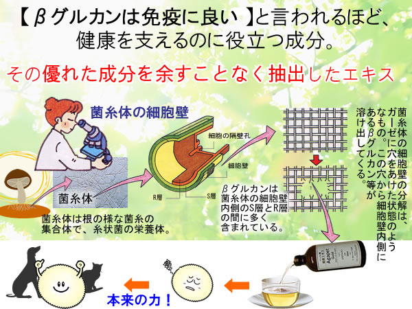 6ヶ月の月日をかけて、 βグルカンが豊富なキノコ類の国産菌糸体から熟成・抽出し、 無添加で製造し極上品質を追求しています。